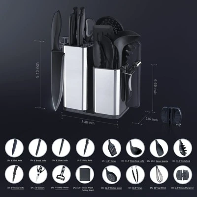 Discover the ultimate 18-piece kitchen utensils set that’s a game – changer for your cooking. This set comes with 5 sharp knives, 7 silicone cooking tools, and 6 kitchen gadgets. The knives’ sharpness is well – recognized, and the silicone utensils are crafted from food – grade material. They can resist temperatures up to 210°C, with anti – scalding handles for a comfortable hold. The set includes a variety of utensils like slotted turners, soup ladles, and more, along with a cutting board and rack. Its innovative design allows you to quickly find the tools you need while saving kitchen space. And with the detachable holder for easy cleaning, it’s a must – have for any kitchen. Whether you’re a professional chef or a home cook, this set will meet all your cooking needs and make your kitchen tasks a breeze.