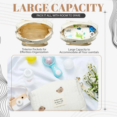 Get a set of two diaper bags that are both practical and charming. The large tote measures 11.8 x 4.72 x 14.2 inches and the small one 9.84 x 3.15 x 6.30 inches, perfect for quick trips and carrying essentials. Crafted from quality lightweight cotton with a stylish quilted trim and cute bear patterns, these bags are not just for diaper duty. They can be used as baby bags in hospitals, beauty bags, toiletry bags, or for daily storage. Whether you’re going for a walk, shopping, having a picnic, or traveling, these lightweight and easy – to – carry bags will add convenience to your life.