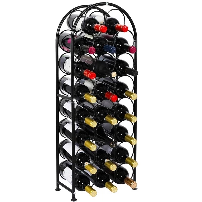 Discover this freestanding floor wine rack that can hold up to 23 standard wine bottles. Crafted from sturdy metal pipes and wire with a durable powder coat finish, it’s anti-oxidation and anti-rust, built to last. The arched design allows it to stand firmly on the floor, and there’s a handle on top for easy relocation. The horizontal storage method keeps the wine in contact with the cork, prolonging wine freshness. It’s perfect for organizing your bar, wine cellar, kitchen, or basement. Installation is a breeze – just fix 5 connected iron rods with 10 screws and adjust the 4 foot pads. It’s a versatile addition to any home or commercial space and makes an excellent gift for wine enthusiasts.