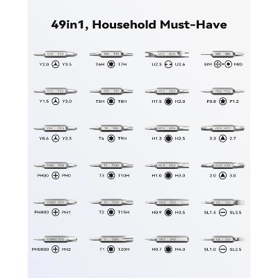 Discover this 49 – in – 1 small screwdriver set, a must – have for both professional fixers and home repair hobbyists. It features 49 different bits in a double – sided design, including Phillips, Flat, Torx and more. Made of high – quality bearing steel, the bits have a hardness over HRC65°, offering excellent resistance to abrasion, oxidation and corrosion. The magnetized tip makes handling tiny screws a breeze. The ergonomic design includes a smooth swivel cap and a unique diamond – shaped full – metal handle for easy operation. It’s not only suitable for disassembling, repairing and reassembling phones, game consoles, wearables, laptops and tablets, but also fits all Ring Doorbell models for tasks like security removal and wifi password reset. The set comes in a small, sturdy case with a stay – shut latch and a bit tip pattern for easy access. This tool set is also an outstanding gift option for various festivals, bringing convenience to your daily repair needs.
