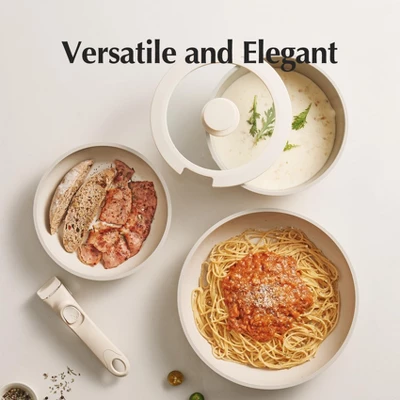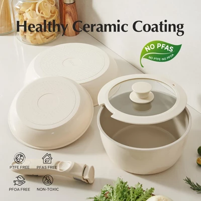 Discover the perfect non – stick cookware set for your kitchen! This set is made of natural ceramic, free from harmful substances like Teflon, PFAS, and lead. It features a stackable design with detachable handles, saving up to 75% of cabinet space, making it a great choice for small kitchens, RVs, and camping. The removable handle allows for seamless transitions between different cooking surfaces, from stoves to the oven and grill. It’s oven – safe up to 842 degrees and compatible with all stovetops. Thanks to its unique patented technology, it has a long lifespan and excellent non – stick properties. The set comes with a 2.5 – quart saucepan, 8 – inch and 10 – inch frying pans, an 8 – inch visible glass lid, and a detachable handle, providing everything you need for daily cooking and outdoor adventures.