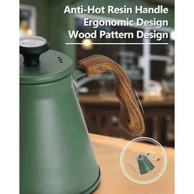 Discover the perfect kettle for your coffee and tea brewing needs! This kettle, with a 37 – fl oz capacity, is made of high – quality 18/8 stainless steel. Its triple – layer base not only enhances heat retention and durability but also ensures uniform heat distribution on various stoves, including gas, electric, induction, and halogen. The built – in thermometer helps you achieve the ideal 195 – 205°F water temperature for extracting the full aroma of your coffee. With a slender gooseneck spout, you can pour slowly and steadily, whether it’s for pour – over, drip, or manual brewing. The heat – resistant resin handle with a wood texture allows for safe and comfortable pouring, and the included heat – insulating base protects your tabletop. It’s BPA – free, resists scale and odors, and is easy to clean. While it holds 1.1 liters, we recommend boiling 0.9 liters at a time to prevent overflow. Its compact design is perfect for small kitchens, serving 3 – 4 cups per brew, bringing convenience to your daily beverage – making routine.