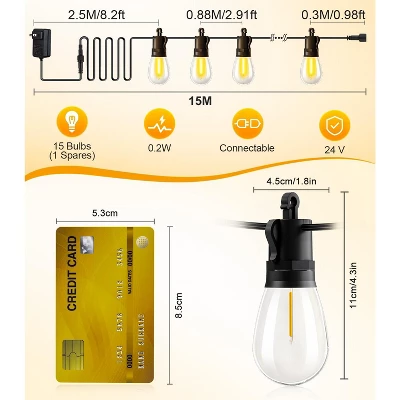 Discover these amazing 50Ft outdoor string lights! With 15 + 1 S14 shatterproof Edison bulbs emitting 2700K high – brightness light, they’re energy – saving, reducing electricity costs compared to traditional bulbs. The IP65 waterproof certification means they can handle all outdoor elements, and the durable cable and insulated design ensure long – term use. Control the lights easily with a remote, adjusting brightness and setting custom timings. Each bulb works independently for reliability. Installation is a breeze with built – in hanging structures and end – to – end expandability. These lights are perfect for a wide range of indoor and outdoor settings like patios, backyards, and parties, adding a warm and inviting atmosphere to any event.