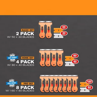 Get this amazing razor blade scraper tool set! It comes with two scrapers and 80 extra blades (30 metal and 50 plastic). The high – quality construction ensures durability for heavy – duty use. With 3 positions for easy blade retraction and extension, and quick blade replacement, it remains effective. The metal blades are ideal for rough hard surfaces like cement floors to clean gum and stains, while the plastic blades are perfect for glass and wood floors without causing damage. It has a wide range of applications, including removing stains, glue, stickers, and old wallpaper. Whether for daily cleaning or DIY projects, it brings great convenience to your life.