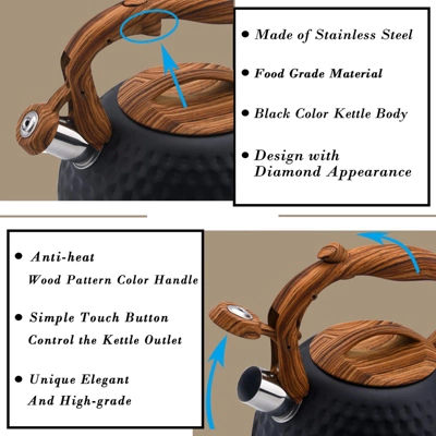 Discover this remarkable tea kettle perfect for your kitchen needs. Crafted from heavy stainless steel, it features a sleek black body with a diamond – like appearance and a wood – pattern handle, adding a touch of elegance. With a 3 – liter capacity, it’s great for families or small gatherings, allowing you to boil enough water for about 12 cups in one go, saving you time. When the water boils, it emits a loud whistle, so you can focus on other activities. The anti – heat, ergonomic handle with a simple – touch button makes it easy and safe to use. It’s suitable for all types of stovetops, including induction, electric, gas, and natural gas. Whether you’re having breakfast or enjoying a tea break, this kettle is a practical and stylish choice for your daily routine.